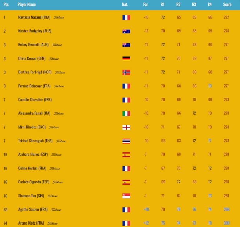 Grâce à un dernier tour de feu (66), Nastasia Nadaud remporte son premier tournoi du Ladies European Tour en gagnant l’Andalucia Costa del Sol Open de España. La pépite du Golf Club d’Aix-les-Bains de 21 ans va arriver en confiance à la finale des cartes américaines du LPGA Tour de la semaine prochaine après ce titre en finale. Perrine Delacour finit 3e. La Singapourienne Shannon Tan enlève son premier ordre du mérite à 21 ans.