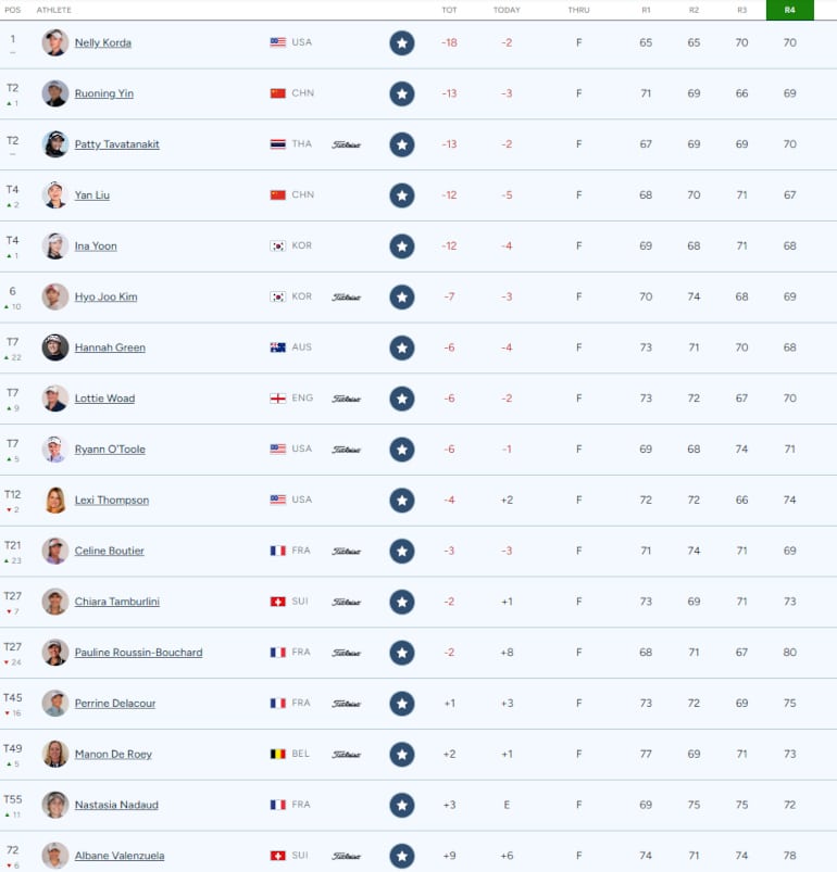 Pour son 28e Majeur à 32 ans, Perrine Delacour se contente d’un top 50. Nastasia Nadaud jouait pour sa part son troisième Majeur de suite, le 1er de sa jeune carrière outre-Atlantique. La joueuse de 21 ans était encore dans le par total à sept trous de la fin, avant de finir à +3 sa semaine au Texas. Pour son deuxième tournoi seulement cette saison, Lexi Thompson signe une superbe 12e place. On retiendra également la retraite officielle de sa compatriote Stacy Lewis, 41 ans et qui a joué enceinte de 4 mois, sans passer le cut.