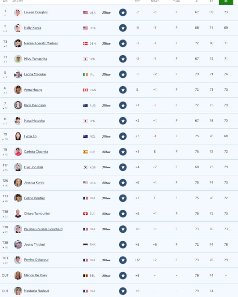 Avec quatre pars et quatre bogeys, Céline Boutier termine son Moving Day dans le par et grimpe de 26 rangs pour pointer à la 33e place. Pauline Roussin-Bouchard connaît une progression similaire malgré son modeste 73, pour passer de la 59e à la 38e place tout comme la Suissesse Chiara Tamburlini (+8). Perrine Delacour a malheureusement conservé la fâcheuse habitude de jouer trois coups de plus que la veille pour la deuxième journée de suite (73-76-79), après notamment deux double bogeys de suite au 16 et au 17, que son seul birdie du jour au 18 peine à atténuer.