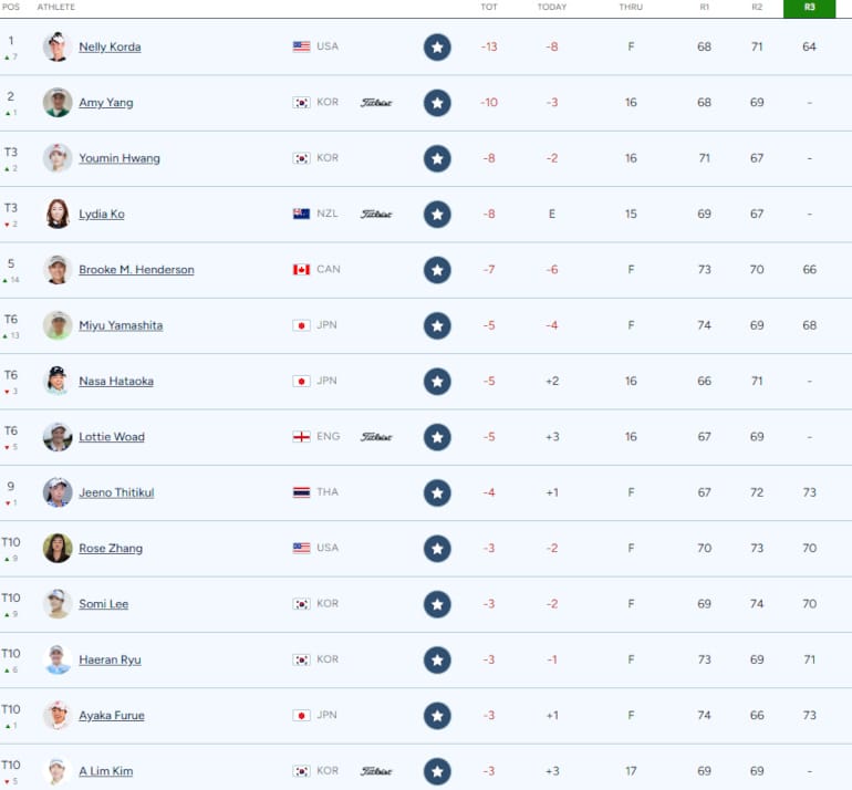 Le vent a considérablement forci au fur et à mesure de la journée, obligeant finalement les organisateurs à stopper le troisième tour alors que les dernières parties étaient au 16. Les balles ne tenaient notamment plus sur le green particulièrement exposé du 17 à cause du vent. La Sud-Coréenne Amy Yang (-10) était à trois longueurs de Nelly Korda, avec encore deux trous à jouer, tout comme sa compatriote Youmin Hwang (-8), qui partage la dernière place du podium avec la lauréate 2024 et encore leader la veille, Lydia Ko.