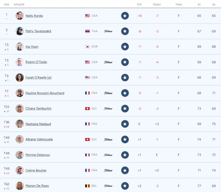 La Belge Manon De Roey termine avec le score du cut (+2) grâce à trois birdies sur ses six derniers trous. Les Suissesses Chiara Tamburlini et Albane Valenzuela franchissent également le cut. Hannah Green, Lydia Ko et la numéro un mondiale Jeeno Thitikul sont les principales victimes du cut, tout comme Stacy Lewis, sortie de sa retraite alors qu’elle est enceinte de quatre mois pour un adieu au public, ou encore l’ancienne numéro un mondiale taïwanaise Yani Tseng, qui a abandonné après 18 trous.