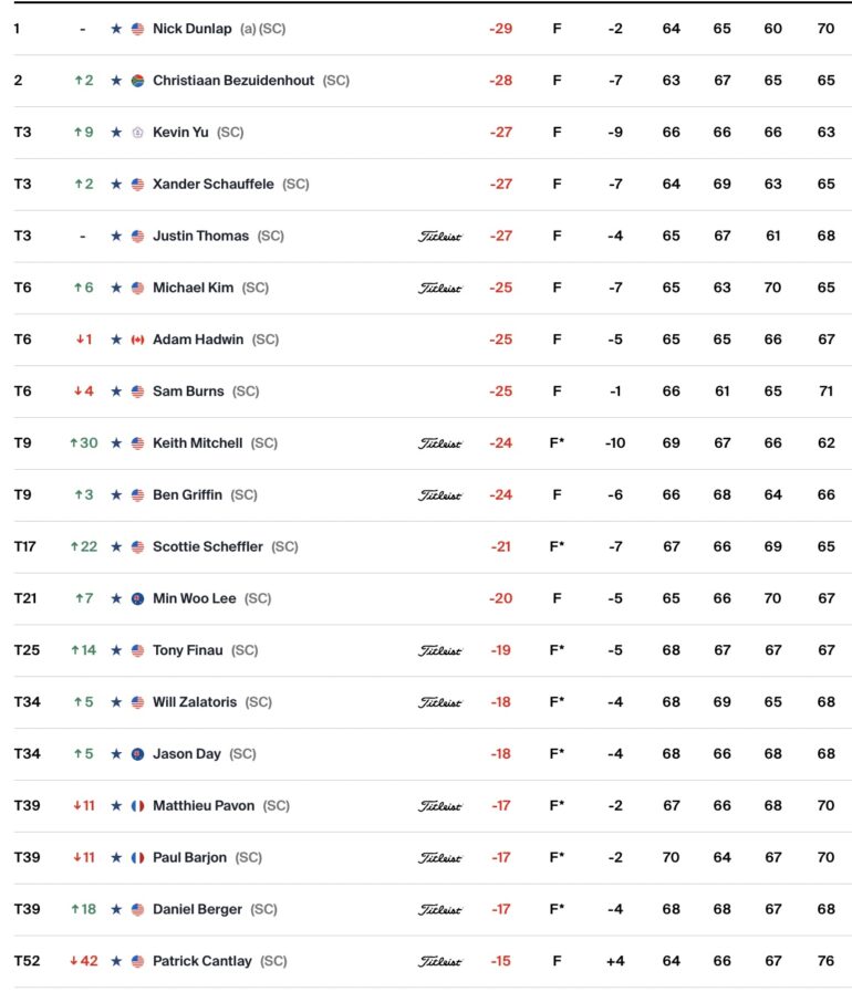 Le podium est complété par un trio dans lequel se trouvent des habitués des tableaux d’honneur du PGA Tour : Xander Schauffele et Justin Thomas. Les deux Américains ont trop tardé à enclencher les birdies pour se montrer véritablement menaçant et bouclent le tournoi à deux coups de Dunlap.