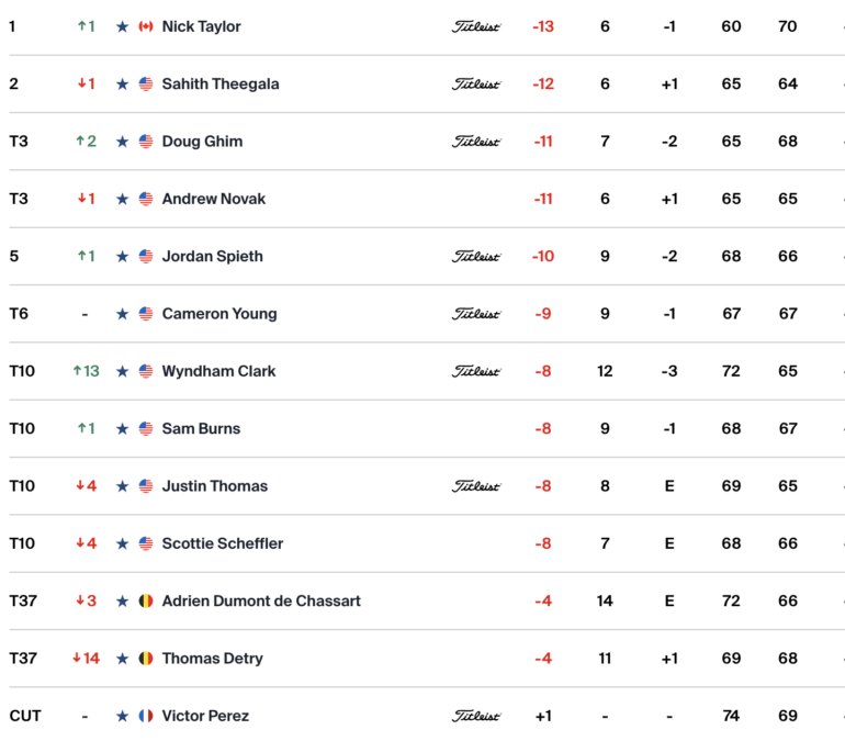 Un peu plus loin, au 10e rang et parfaitement dans le coup pour la victoire compte tenu de ce qu’il reste à jouer, on retrouve des noms comme celui du n°1 mondial et double tenant du titre Scottie Scheffler, ou encore Sam Burns, Justin Thomas…