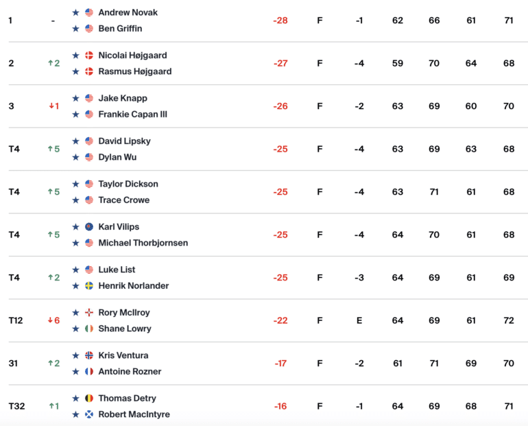 Avec à leurs trousses les ogres Rory McIlroy–Shane Lowry, mais aussi les frères Rasmus et Nicolaï Højgaard, ou encore les jeunes Californiens Jake Knapp et Frankie Capan III, Novak (30 ans) et Griffin (28 ans) avaient de quoi être nerveux. Surtout le premier nommé, qui avait déjà eu l’occasion, une semaine plus tôt, de s’imposer. Le natif de Raleigh avait manqué son putt pour la victoire dans le RBC Heritage avant de céder en play-off face à Justin Thomas.