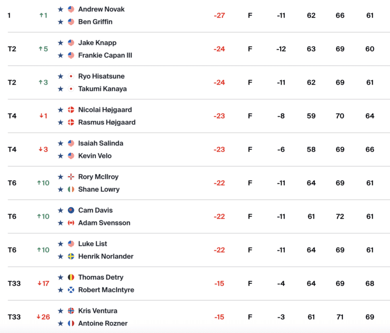 Dimanche, les Irlandais seront à la chasse d’Andrew Novak et de Ben Griffin. Les deux Américains, auteurs également d’une carte de 61, sont tous les deux à la recherche d’une première victoire sur le PGA Tour. Le premier nommé tourne autour depuis quelques temps. Deuxième à Harbour Town après avoir été battu en play-off par Justin Thomas il y a une semaine, Novak a aussi terminé 3e du Valero Texas Open juste avant. Il est l’homme en forme sur le circuit.