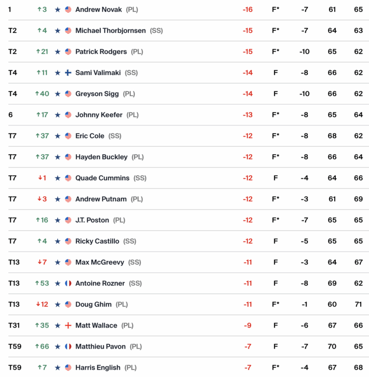 Derrière, les trois leaders du premier jour ont eu du mal à tenir la cadence. Les poursuivants immédiats de Novak sont Patrick Rodgers et Michael Thorbjornsen, qui eux aussi sont assurés d’être sur le PGA Tour en 2026 et qui visent leur premier succès sur ce circuit. Les contes de fées peuvent encore se produire cette semaine, mais dans le top 10 provisoire du tournoi, aucun joueur qui n’y figure pas n’est pour le moment en mesure de rentrer dans le top 100.