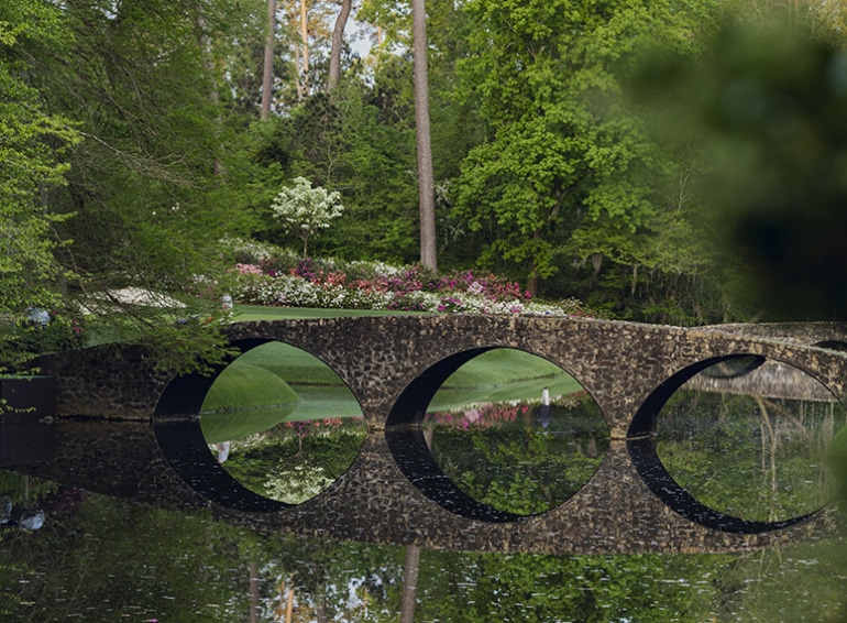 C’est aussi, on l’a évoqué, un trou merveilleux sur le plan visuel. Bordé de massifs d’azalées en fleurs, roses et blanches, le green est un véritable tableau vivant au printemps. Derrière, le pont Hogan (nommé ainsi en hommage à Ben Hogan), tout en élégance, relie le 12 au 13. Il n’y a pas de tribunes autour du green, ce qui laisse l’impression de jouer dans un jardin secret.