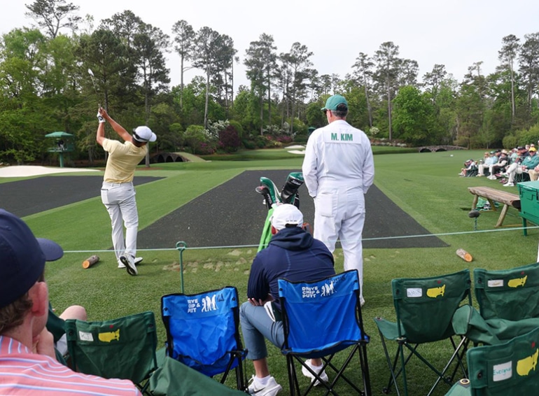 Golden Bell. C’est son nom. Ce bijou mesure pourtant moins de 150 mètres (142 mètres le plus souvent), mais c’est un trou immense. À peine arrivé pour la première fois dans ces lieux magiques, on a voulu le voir de nos propres yeux. Bonne surprise : il y avait des sièges disponibles au premier rang des spectateurs pour le coup frappé de bon matin par Michael Kim. L’émotion nous a saisis quand la balle de l’Américain s’est élevée dans le ciel de Géorgie pour finir sa course à trois mètres du drapeau.
