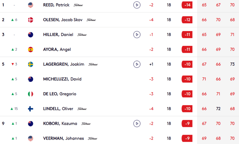 Associé à Joakim Lagergren en dernière partie, le vainqueur du Masters 2018 n’a ainsi nullement été « perturbé » par le départ canon du Suédois, auteur de trois birdies sur ses six premiers trous. A l’usure, le Texan a indirectement ruiné les espoirs du Scandinave, ce dernier voyant son jeu se dérégler à partir du 8, alignant par la suite les boulettes sur ses mises en jeu et autres bogeys. Quatre en tout qui l’obligent à reculer au 5e rang au leaderboard avec l’unique carte au-dessus du par (73) au sein du top 14 dans ce Moving Day.