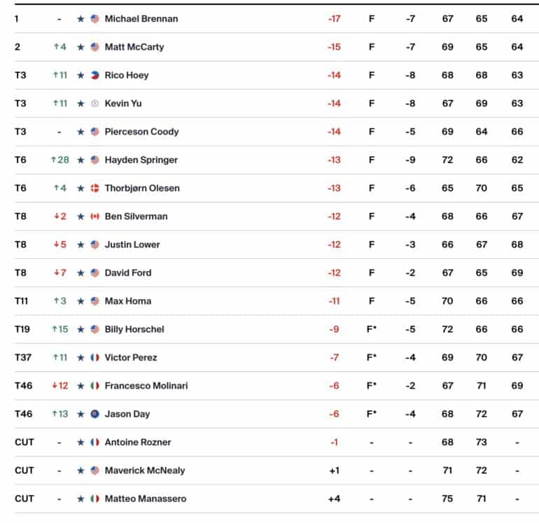 Dans une journée de samedi marathon, où une partie de champ a du finit le deuxième tour avant de repartir pour le troisième dans la foulée, le Français Victor Perez a parfaitement su se relancer. Les commandes n’ont elles pas changé de mains et appartiennent toujours à Michael Brennan en -17, deux coups devant la concurrence.