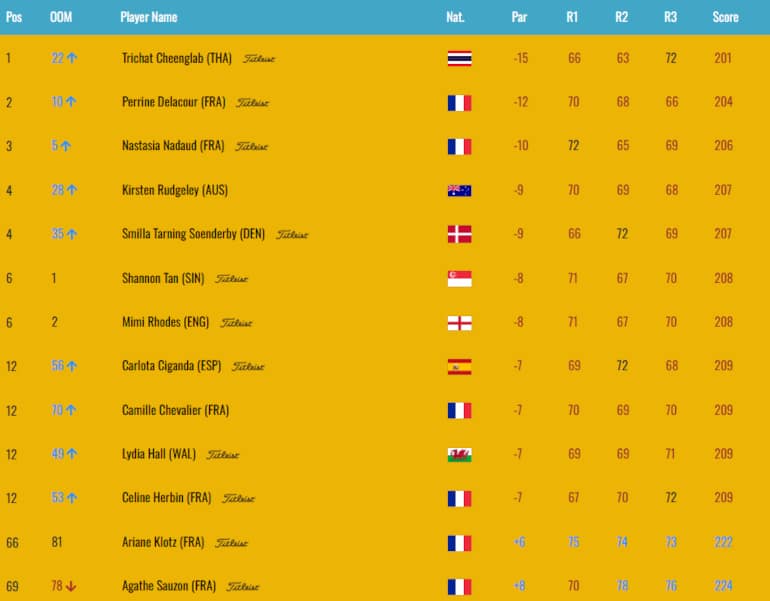 Déjà très en vue la veille, les Françaises restent aux avant-postes avec deux représentantes tricolores sur le podium ! Perrine Delacour a signé la plus belle carte de la journée (66) pour grimper au deuxième rang à -12. La lauréate du South African Women’s Open cette saison vise le top 15 de l’ordre du mérite qui lui ouvrirait les portes du Women’s Open en 2026 (elle est actuellement 15e). La Picarde pourra mettre la Pression dimanche sur la Thaïlandaise Trichat Cheenglab (-15), leader depuis le premier jour, mais qui a joué neuf coups de plus que vendredi pour laisser revenir Delacour à trois longueurs avant les dix-huit derniers trous.