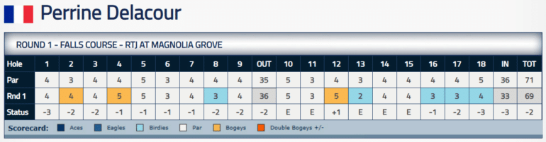 Convoquée sur le Falls Course (par 71), Perrine Delacour s’en est plutôt bien sortie avec une carte de 69 (-2). La Française, troisième à la finale du LET en Espagne le week-end passé, a bouclé son aller (elle est partie du 10) en 33 (-3) grâce notamment à trois birdies consécutifs du 16 au 18 avant de coincer sur le retour avec deux bogeys aux trous 2 et 4 atténués néanmoins par un ultime birdie au 8.