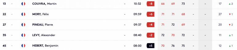 Toujours dans le ventre mou (27e à -4), Pierre Pineau reste pour l’instant dans le top 22 du général. Alexander Levy (35e, -2) et Benjamin Hébert (45e, +5) sont plus loin au classement.