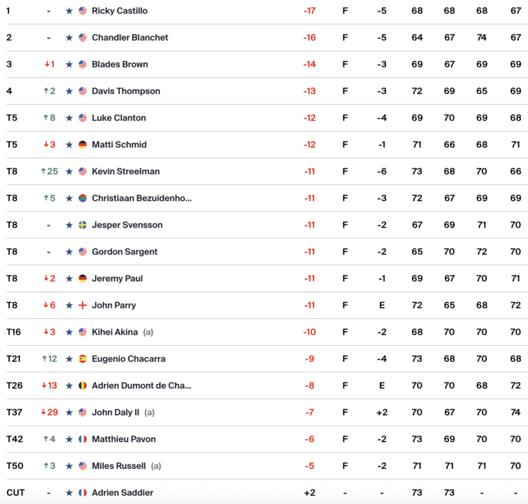 Le tournant du tournoi ? Ses deux birdies consécutifs au 13 et au 14, qui lui ont permis de prendre le large sur ses rivaux. Qui soit ont trébuché à cet instant (Blades Brown), soit on fait du surplace dans le final (Davis Thompson, Matti Schmid). Le leader des deux premiers tours, Chandler Blanchet, a toutefois réussi un birdie sur le 72e trou qui a fait trembler jusqu’au bout Ricky Castillo.