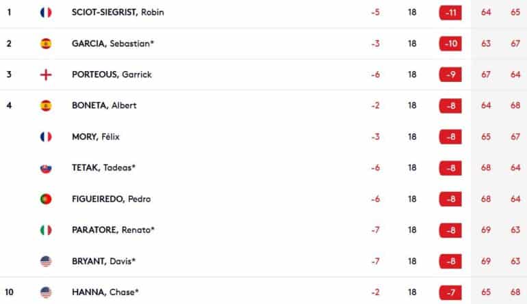 Son score de -11 (129) après 36 trous lui permet de prendre le commandement du tournoi (il était deuxième ex aequo il y a vingt-quatre heures) juste devant l’Espagnol Sebastian Garcia, qui s’est contenté aujourd’hui d’un 67 (-3) avec quatre birdies pour un bogey, et l’Anglais Garrick Porteous, victorieux ici même en 2024, troisième à -9 (131) après avoir joué un impressionnant 64 (-6).