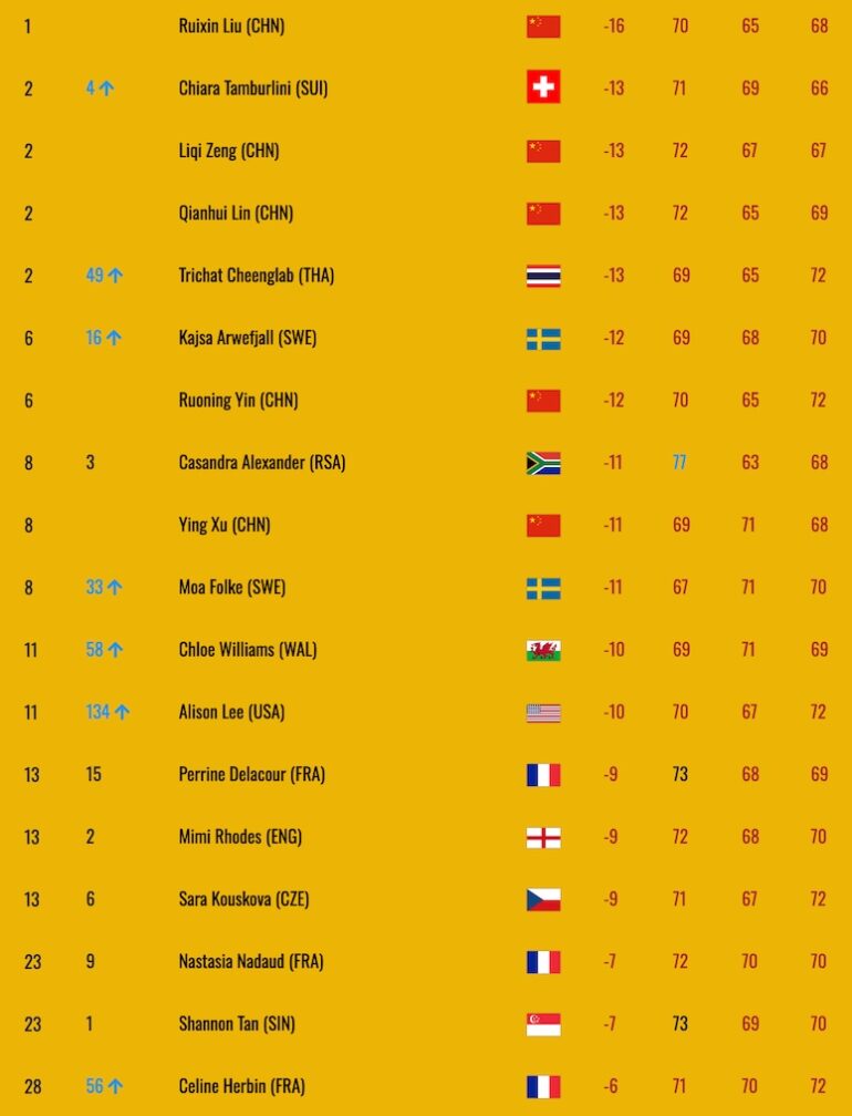 La représentante de l’Empire du Milieu a aussi signé trois birdies pour une carte de 68 (-5) qui lui a permis de devancer de trois coups ses compatriotes Qianhui Lin (69/-4) et Liqi Zeng (67/-6) ainsi que deux anciennes numéro un européennes : la Suissesse Chiara Tamburlini (66/-7) et la Thaïlandaise Trichat Cheenglab (72/-1).
