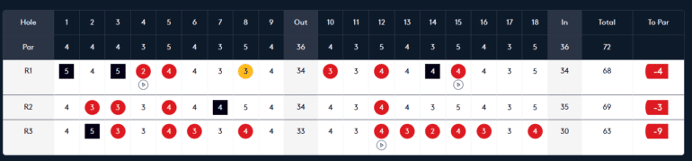 Pour y parvenir, l’actuel 57e joueur mondial doit l’emporter ce dimanche. Auteur ce samedi (ses trois cartes si dessous) d’un superbe 63 (-9) avec notamment un finish de champion (six birdies du 12 au 18), co-leader à -16 avec Casey Jarvis, il est en train de gagner son pari. Au départ de ce 3e tour, il accusait encore cinq coups de retard sur le Sud-Africain.
