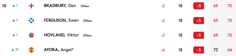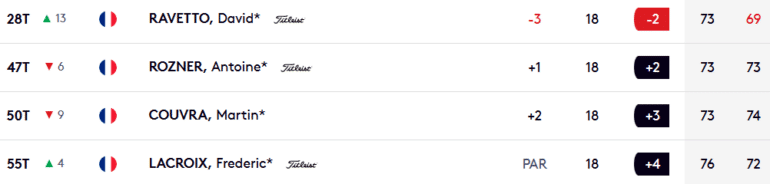 Plus loin, bien plus loin, au-delà du top 20, on retrouve dans le clan tricolore David Ravetto (28e à -2) puis Antoine Rozner (47e à +2 avec deux cartes de 73), Martin Couvra (50e à +3) et Frédéric Lacroix (55e à +4).