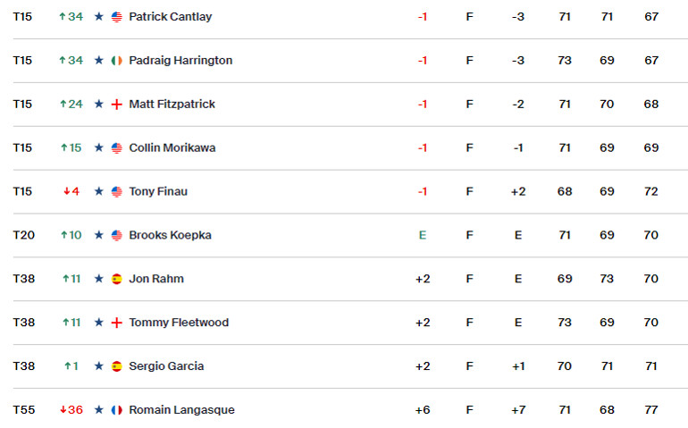 Brooks Koepka reste dans le par total malgré une jolie sortie de bunker au 12. Quant à Jon Rahm (qui détient maintenant le record du nombre de cuts d’affilée en Majeur pour les joueurs en activité avec 16 unités), il végète au 38e rang (+2), toujours aussi énervé par son niveau de jeu qui ne lui permet pas d’enchaîner les birdies et qui ne l’empêche pas de concéder quelques bogeys.