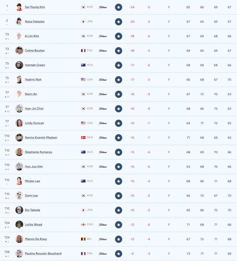 Tenante du titre, sa compatriote Hannah Green a signé un 66, son meilleur score de la semaine, pour remonter à la 5e place. C’est le même que la néo-pro Lottie Woad, révélation de l’année, qui s’est ainsi hissée au 24e rang, à égalité avec la Belge Manon De Roey et Eun-Hee Ji, dont c’était le dernier tournoi. En 19 saisons sur le LPGA Tour, la Coréenne a remporté six titres dont l’U.S. Women’s Open en 2009.
