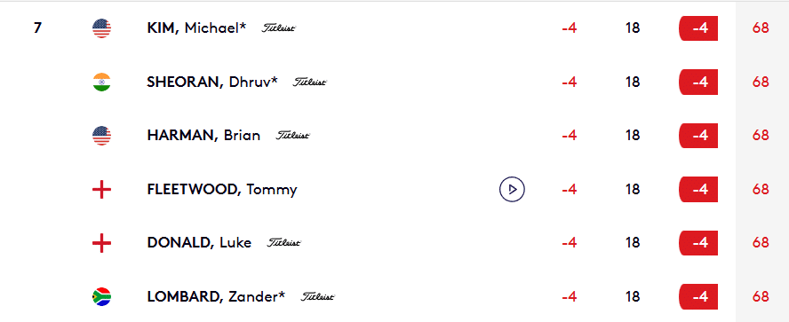 Rapide tour d’horizons des autres mastodontes de la semaine : les Américain Harman et Griffin commencent par un 68 (-4) tout comme Tommy Fleetwood et partagent la 7e place. Viktor Hovland est lui 44e après un 71 (-1).