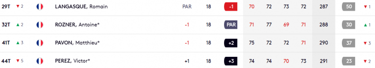 Un épilogue ô combien excitant dans lequel on retrouvera quatre Français. 29e à -1 (287), Romain Langasque prend la 50e place du ranking qualificative pour le DP World Tour Championship. Auteur d’un ultime 71 (-1), Antoine Rozner finit 32e dans le par total (288) et accroche surtout pour le moment un ticket pour l’Open britannique 2023 au Royal Liverpool. Le Racingman pointe à la 30e place du ranking.