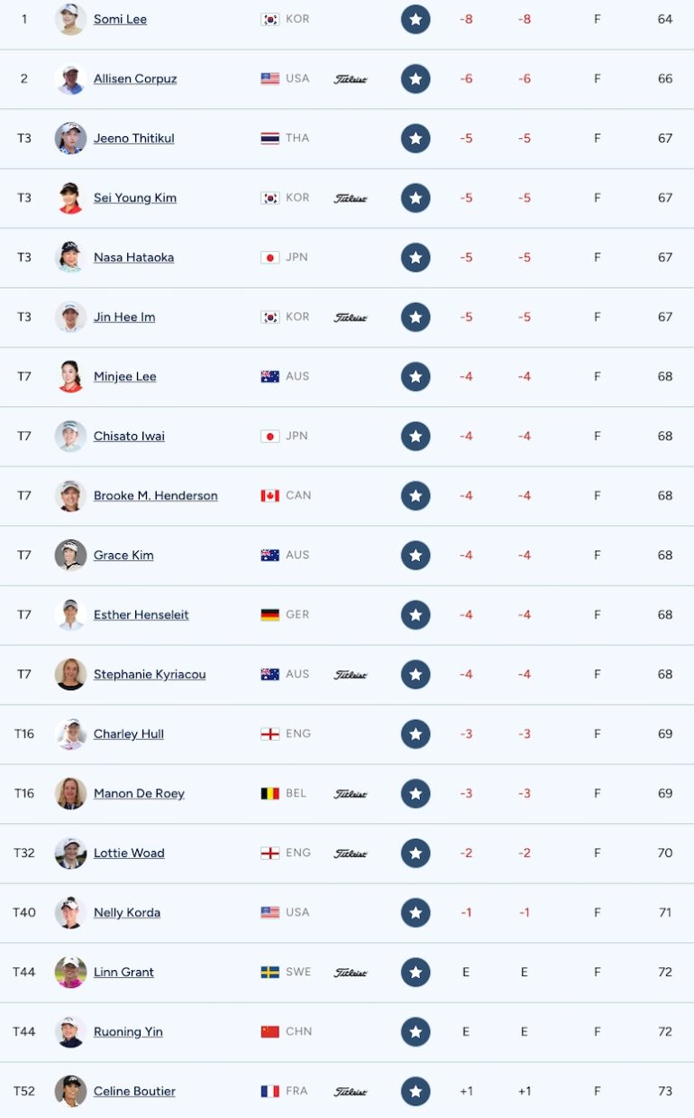 La Sud-Coréenne devance de deux coups l’Américaine Allisen Corpuz et de trois ses compatriotes Sei Young Kim et Jin Hee Im, la Japonaise Nasa Hataoka et l’actuelle n°1 mondiale et tenante du titre, Jeeno Thitikul.