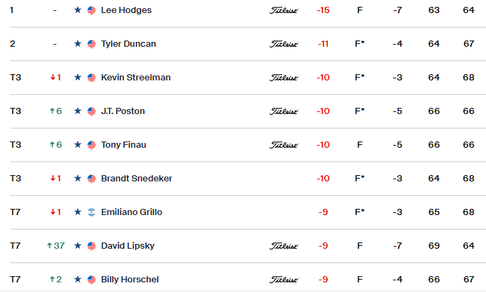 Les coleaders très provisoires vendredi soir, pendant un peu plus de trois heures, étaient Kevin Streelman et JT Poston, qui avaient joué respectivement en 68 et 66 lors de ce 2e tour. Car Lee Hodges, seul en tête jeudi soir, avait été arrêté après le 8, alors qu’il était lui aussi passé à 10 coups sous le par quand le jeu a été suspendu par les organisateurs, .