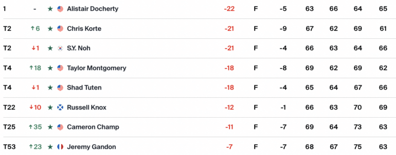 Alistair Docherty a ainsi enregistré son tout premier titre en carrière sur le Korn Ferry Tour. Cette saison, il n’avait passé qu’un seul cut (en quatre épreuves), qu’il avait parfaitement bonifié par une deuxième place aux Bahamas. Grâce à ce succès, le golfeur de 31 ans a obtenu son ticket pour le prochain The Open qui se déroulera du 16 au 19 juillet au Royal Birkdale. Il s’était qualifié l’an dernier pour l’U.S. Open, quelques jours à peine après avoir frôlé la mort dans un grave accident de voiture.