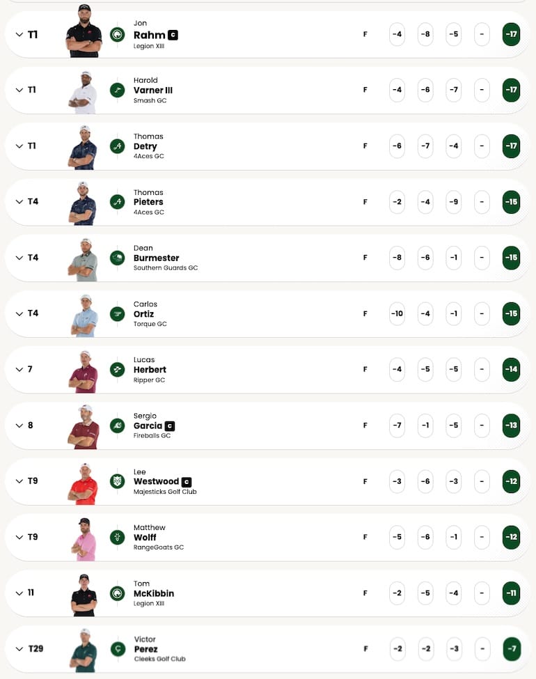 C’est le Smash GC de ce dernier qui occupe la tête du classement par équipe devant le 4 Aces GC de Thomas Detry, Dustin Johnson, Anthony Kim et Thomas Pieters.