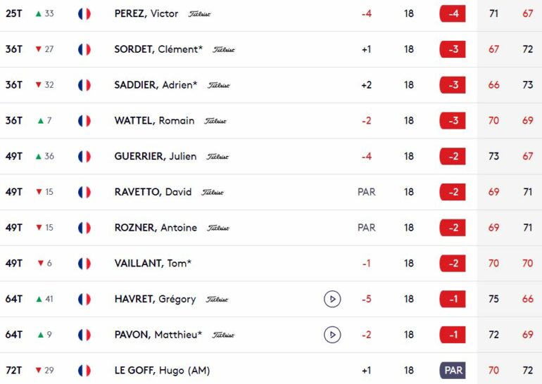 Sur les dix-neuf Tricolores engagés cette semaine, dix d’entre eux franchissent le cut fixé à -1. Outre Grégory Havret qui poursuit l’aventure 48 heures de plus, à son 560e tournoi sur le DPWT, on retient la petite bouffée d’oxygène que s’est offerte Clément Sordet, malgré deux bogeys sur ses deux derniers trous (parti du 10). Le Lyonnais installé en région niçoise se devait de franchir ce premier écueil pour encore espérer conserver sa carte en 2025.