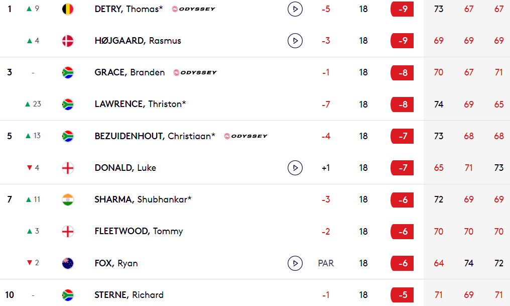 Grâce à deux 67 (-5) signés lors de ce samedi marathon, le Belge Thomas Detry (photo) s’offre la tête du Nedbank Golf Challenge. A -9 (207), il partage les commandes avec le Danois Rasmus Højgaard, auteur d’un troisième 69 (-3) d’affilée. Le duo compte un point d’avance sur les Sud-Africains Branden Grace et Thriston Lawrence. Meilleur français après 54 trous, Romain Langasque pointe en 27e position à -1 (215).