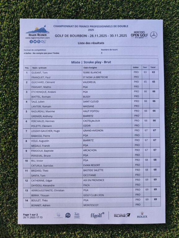Convoqués à 10h36 locale (7h36 en métropole) en antépénultième partie, Tom Guéant, 24 ans, et Paul Franquet, 20 ans, qui découvrent le tournoi cher à Jean-Marie Hoarau, le Président de la Ligue de La Réunion et grand ordonnateur de l’événement, se sont, eux aussi, fait plaisir en sortant ce score référence qui leur offre les commandes du tournoi. Sous le soleil évidemment et un vent de plus en plus généreux au fil de la journée, la doublette venue respectivement de Terre Blanche et de St-Nom-la-Bretèche n’a ainsi guère laissé de répit à ce par 72 pourtant loin d’être simple à négocier.
