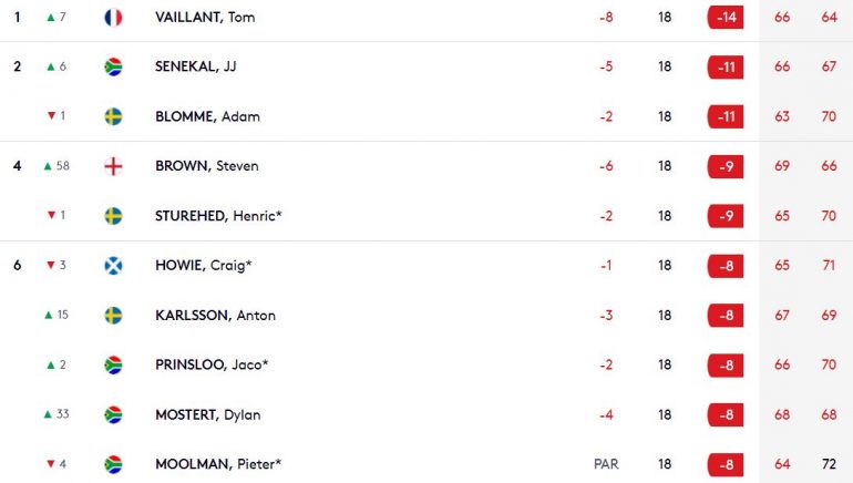 Avec un score total de -14 (130), Tom Vaillant, 567e joueur mondial, qui n’avait pas passé le cut la semaine passée à Limpopo, possède trois points d’avance sur un duo composé du Sud-Africain JJ Senekal, victorieux justement au SDC Open dimanche dernier, et du Suédois Adam Blomme, leader après dix-huit trous et actuellement en tête de la Road to Mallorca.