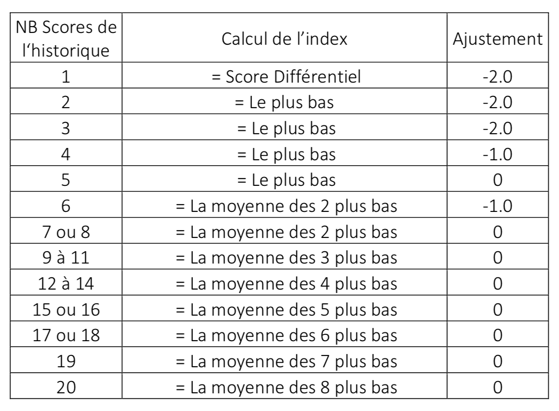 Exemple : Je suis 20.7 Je réalise un Score Différentiel de 12.3. Différence = 20.7 -12.3 = 8.4. Le système recalcule ma moyenne de mes 8 meilleurs Scores Différentiels. Disons que cette moyenne est désormais 17.4, mon nouvel Index sera 17.4 – 1= 16.4