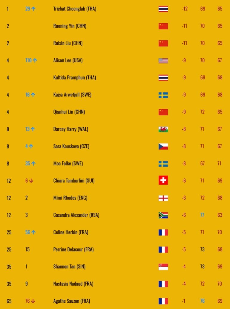 La Thaïlandaise Trichat Cheenglab (photo) devance d’un coup les Chinoises Ruoning Yin et Ruixin Liu à l’issue du 2e tour de l’Aramco China Championship, et a remporté la compétition par équipe. Céline Herbin et Perrine Delacour pointent à la 25e place.