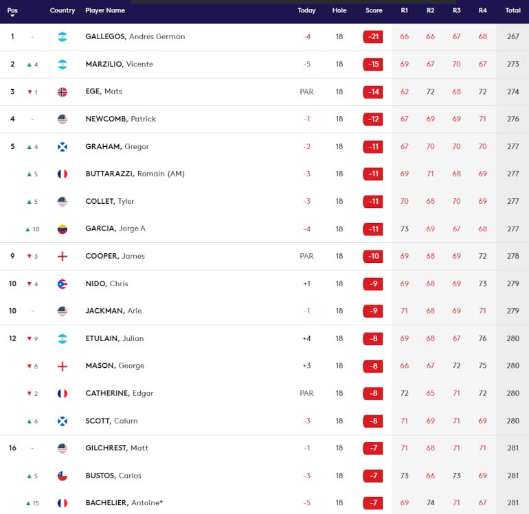 Andres German Gallegos🇦🇷 leads 18 players through the last event of First Stage Q-School, ending the week six clear on 21 under par in France.