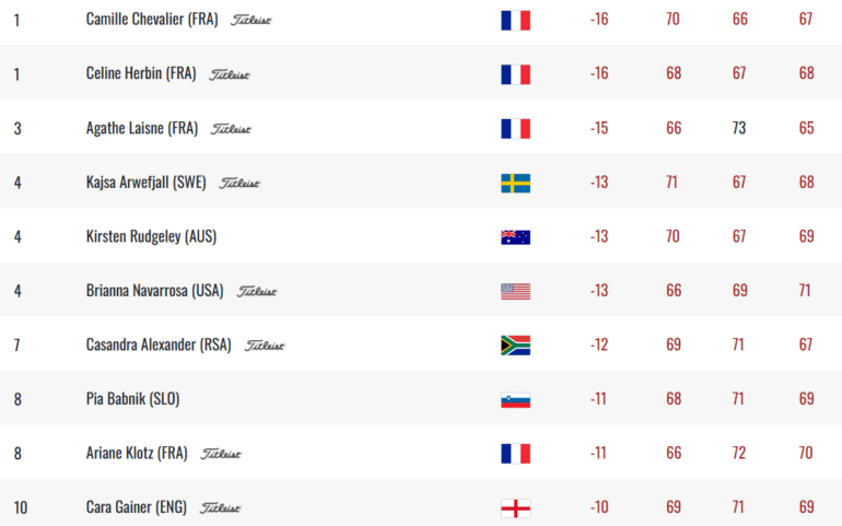 La Suédoise Kajsa Arwefjall, l’Australienne Kirsten Rudgeley et l’Américaine Brianna Navarrosa, seulement 71 (-2) aujourd’hui, sont en embuscade à -13 (206), juste devant la Sud-Africaine et n°1 de l’ordre du mérite, Casandra Alexander, -12 (207). Son 67 sans la moindre rature lui permet de continuer d’y croire. Quatre coups la séparent de Chevalier et Herbin.