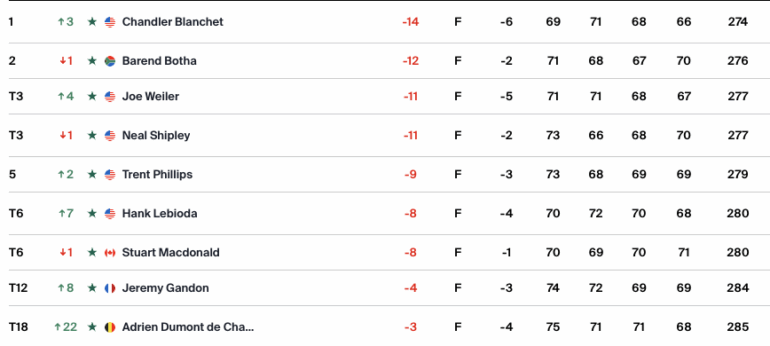 La victoire, et les 270 000 $ qui l’accompagnent, est revenue à l’Américain Chandler Blanchet, déjà assuré du PGA Tour avant cette finale. Il a devancé de deux coups le Sud-Africain Barend Botha, à qui il fallait une victoire pour intégrer l’élite.