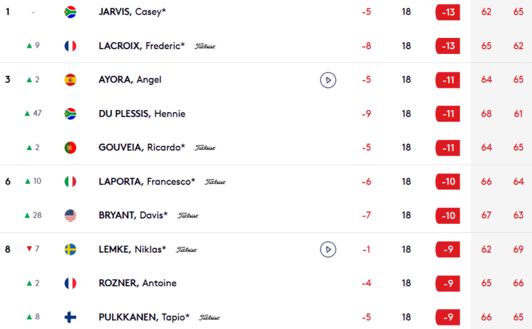 Bénéficiant une fois encore de conditions de jeu optimales ce vendredi à Nairobi, Frédéric Lacroix, actuellement 68e de la Race, a volé au-dessus du Karen Country Club avec une carte immaculée de 62 (-8). Huit birdies distillés équitablement entre les neuf trous de son aller (parti du 10) et les neuf trous du retour. A -13 (127) après 36 trous, le Français pointe en tête du Magical Kenya Open aux côtés du Sud-Africain Casey Jarvis, qui s’est contenté d’un 65 (-5) aujourd’hui après avoir joué 62 lui aussi la veille.