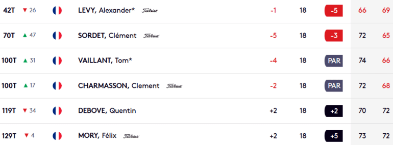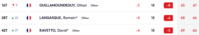 Auteur d’un superbe finish – birdie 16, 17 et 18 – Antoine Rozner demeure dans le top 10 à -9 (il était 10e jeudi soir). Il fait partie des six Français qui franchissent le cut fixé à -4. Citons ainsi Oihan Guillamoundeguy, 16e à -8 (132), Romain Langasque (28e à -6) juste devant David Ravetto et Alexander Levy (42es à -5).