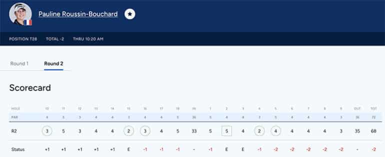 La bonne nouvelle côté français est la belle carte de Pauline-Roussin Bouchard (68) qui lui assure de passer le cut, après un premier tour manqué. On a retrouvé celle qui a signé cinq top 10 d’affilée sur le Ladies European Tour en deux mois, entre août et octobre. Elle a signé cinq birdies et ce chiffre aurait même pu être meilleur si elle avait mieux négocié les par 5.