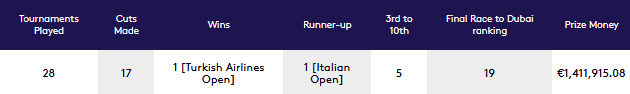 Après un top 10 pour son tout premier tournoi de la saison à Leopard Creek pour l’Alfred Dunhill Chammionship, ses deux premiers top 5 quelques semaines plus tard dans le golfe annonçaient déjà la couleur. C’est lors de la tournée asiatique qu’il se révèle vraiment en enchainant une nouvelle 5e place en chine avec sa grande première victoire sur le DP World Tour.