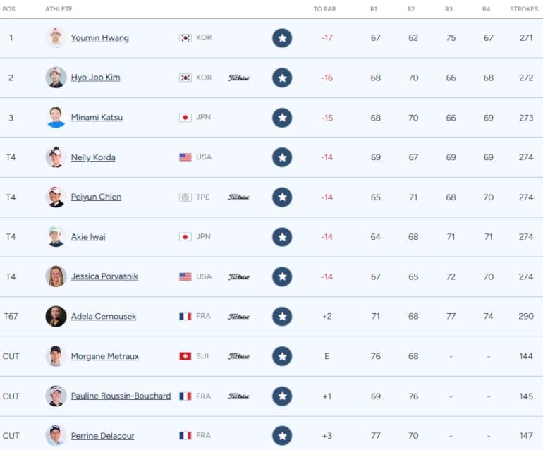 Avec son ultime birdie au 18, Youmin Hwang a finalement devancé sa compatriote Hyo-Joo Kim, lauréate en 2022, d’un coup ! La Japonaise Minami Katsu complète le podium. Nelly Korda termine au pied du podium, aux côtés de la japonaise Akie Iwai, grande animatrice de la semaine. C’est le sixième top 5 de la saison pour l’Américaine, qui n’a pas encore gagné en 2025.