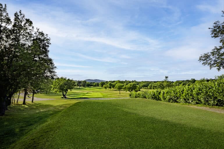 Le par 3 du 3e trou, long de plus de 185 mètres depuis les départs arrière, plonge vers un green en contre-bas : un premier test visuel et technique qui donne le ton. Le 4 séduit par sa fausse simplicité, tandis que le 6 — l’un des moments forts du parcours — offre un panorama saisissant. Depuis son départ perché, on vise un fairway niché dans la pente avant de remonter vers un green dominant la vallée, avec les montagnes en toile de fond.