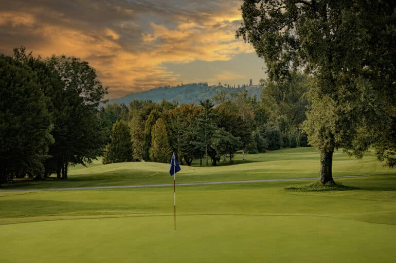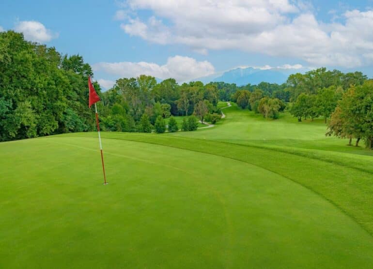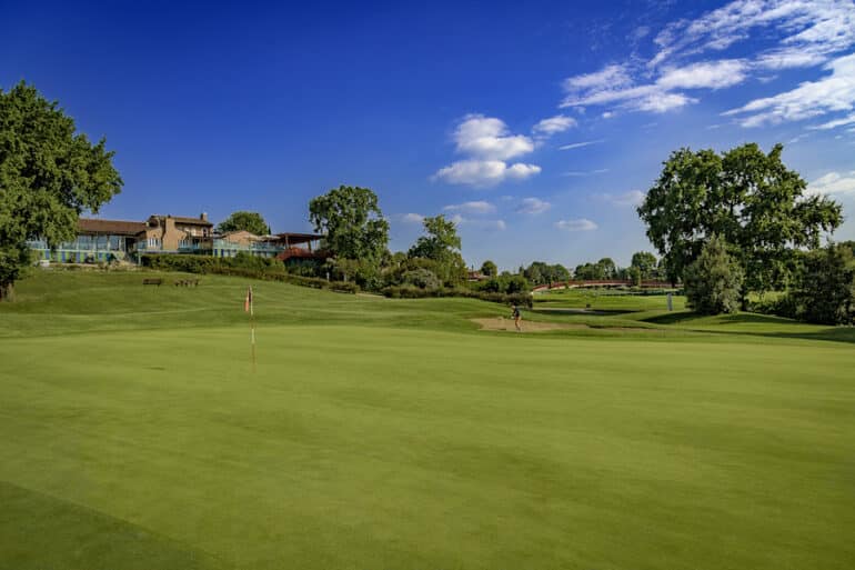 Situé à Fagagna, classé parmi les plus beaux villages d’Italie, le Golf Club Udine incarne parfaitement cette identité faite de nature préservée, d’architecture paysagère et d’art de vivre. À seulement dix kilomètres d’Udine et de San Daniele — patrie du prosciutto — le parcours s’étire au pied des Préalpes, dans un paysage façonné par l’extrémité des Dolomites. Il propose un cheminement apaisant au milieu de plus de 7 000 arbres centenaires. Si les fairways sont relativement étroits, le sous-bois dégagé limite les risques de balles perdues.