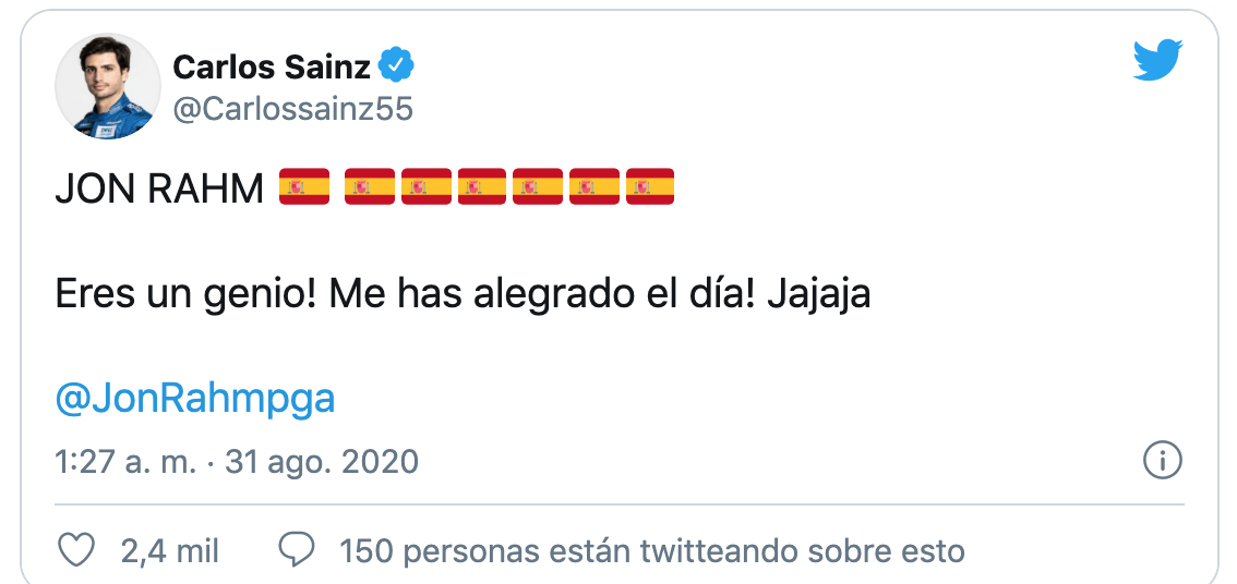Ceci n’a pas empêché le pilote espagnol d’afficher sa joie sur Twitter… parce que ce fou de golf voulait saluer ainsi la victoire de Jon Rahm au BMW. « Jon, tu es un génie ! Tu as enchanté ma journée ! » a-t-il déclaré après l’incroyable putt qui lui a donné la victoire à son copain espagnol.