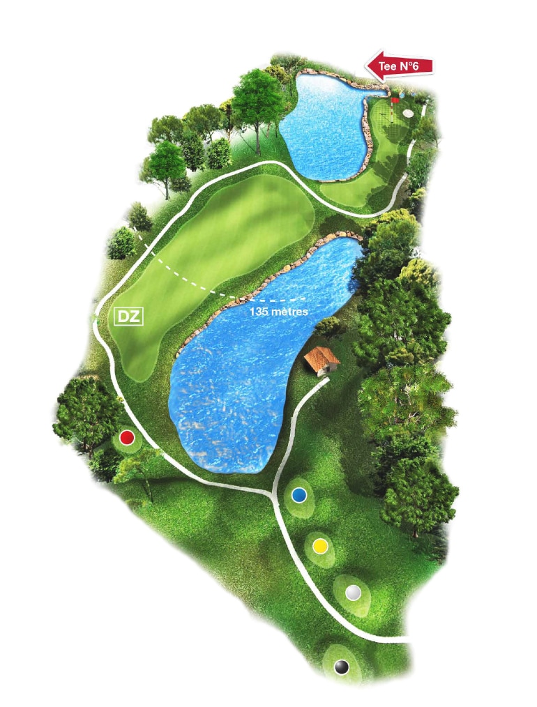 Il faudra jouer votre second coup à 90 degrés vers la droite pour atteindre le green défendu par un nouvel obstacle d’eau orné d’un joli jet d’eau en son centre. Si vous avez mis votre balle dans l’eau au départ, vous pourrez encore arracher un par miraculeux en tentant de driver le green depuis la dropping zone située à 210 mètres du green. Une solution kamikaze conseillée uniquement en cas de match play ! Mais encore une preuve que ce trou est aussi diabolique que challenging.