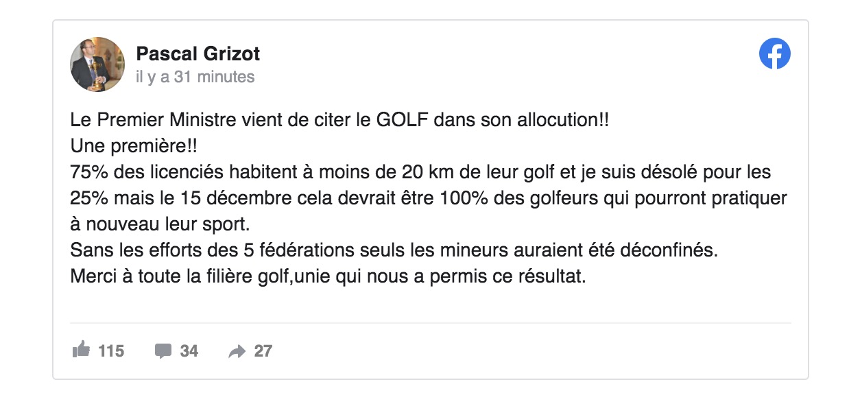 Celui-ci a précisé sur son compte facebook que 75% des Golfeurs Français avaient la chance de résider à moins de 20 kilomètres d’un parcours et s’est félicité que le Premier Ministre ait prononcé le mot “golf” dans cette prise de parole.