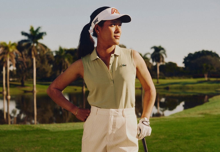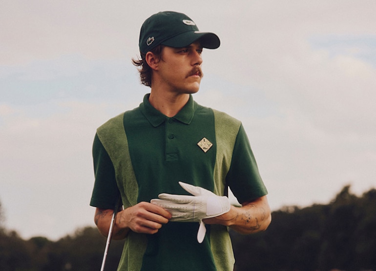 Sur le plan stylistique, Lacoste mise sur des silhouettes précises et aérées, pensées pour offrir un maximum de liberté tout en conservant une vraie tenue. Les ensembles coordonnés côtoient des pièces plus polyvalentes, faciles à porter sur le parcours comme en dehors. La palette de couleurs, elle, oscille entre verts profonds, tons sable et nuances pastel lumineuses, traduisant une vision apaisée mais moderne du vestiaire golf. Certains modèles intègrent également une dimension plus graphique, à l’image de pièces inspirées des archives de la marque du début des années 1990, apportant une touche visuelle plus marquée et assumée à l’ensemble.